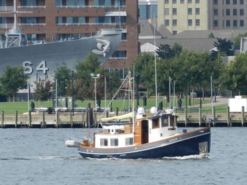 A Lord Nelson 37 Victory Tug passes the Wisconsin. A Maine lobster style underbody, with a sheer and house patterned after Moran tugs of the 50's, named after Vice Admiral Lord Horatio Nelson, and built in Taiwan. See: <http://www.lnvt.org/>. Always wanted one.