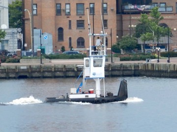 US Army Corps of Engineers patrol vessel "Harrell" is a familiar sight in Hampton Roads. Here she is at Mile "0" with the bow of the Battleship Wisconsin and the Hampton Roads Naval Museum in the background.