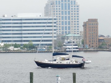 One of the Elizabeth River Ferries "steams" past the office. There are three; usually just one is in service on the half hour round trip to Norfolk. A second gets pressed into service during summer events and a third runs to the ballpark for the AAA Norfolk Tides games. It is a cool city where you can ride to the mall, the ball park, restaurants or work on the ferry and not need a car at either end; even cooler that the ride is 75 cents when you're over 60.