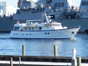 There is something special about older motoryacts. This is the 78' CHINTA MANIS, built by Stephens Marine in 1975. She is headed south down the ICW, the Arleigh Burke class destroyer, USS MASON, is headed north under tug assist.