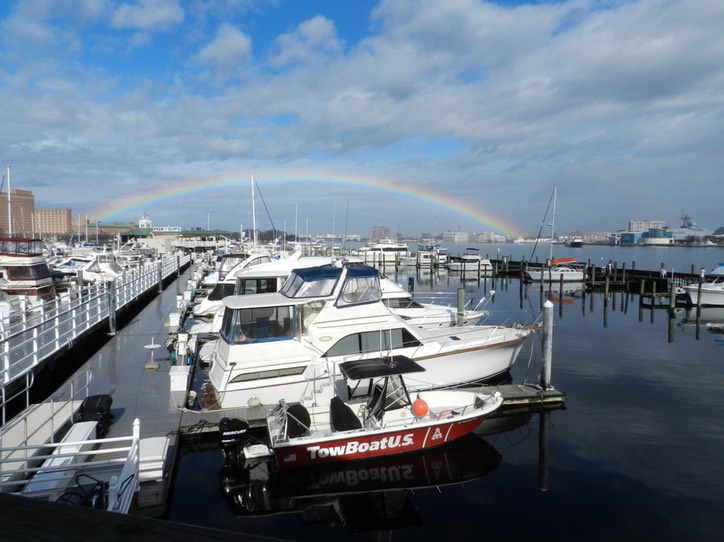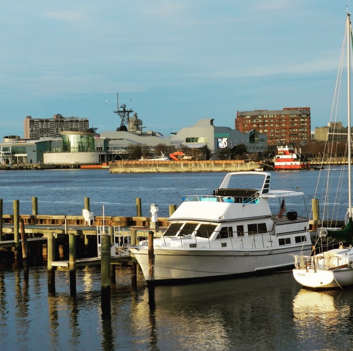 US Army Corps of Engineers patrol vessel "Harrell" is a familiar sight in Hampton Roads. Here she is at Mile "0" with the bow of the Battleship Wisconsin and the Hampton Roads Naval Museum in the background.